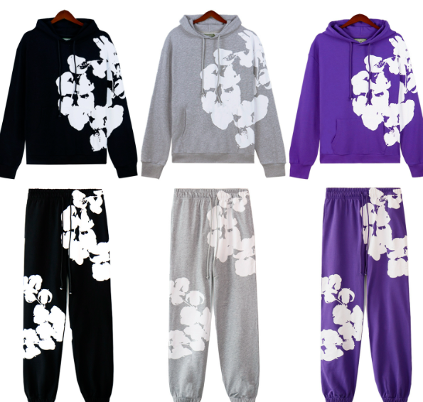 DENIM TEARS main line kapok flower sweatshirt with oversized floral wreath and jogger pants, colors: black, gray, purple.