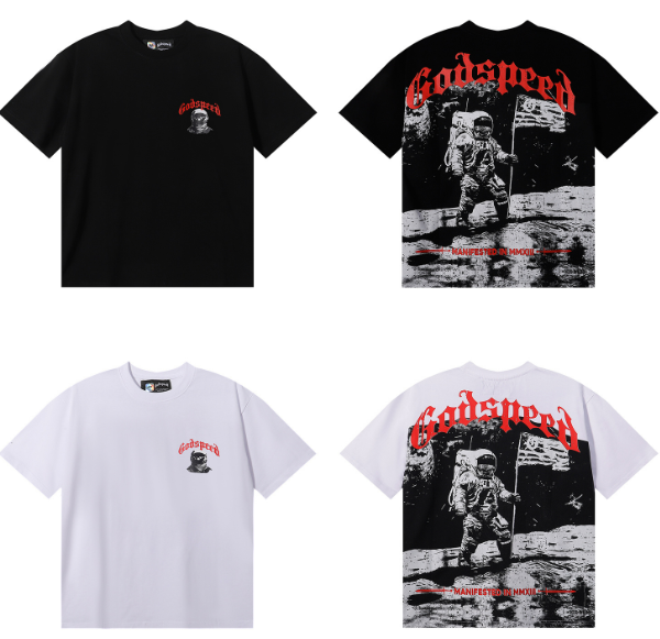 Camiseta informal de manga corta de algodón puro de doble hilo de alta densidad con estampado de astronauta Godspeed y aterrizaje lunar, para hombre y mujer. Colores: Negro, Blanco. Tallas: S, M, L, XL, XXL.