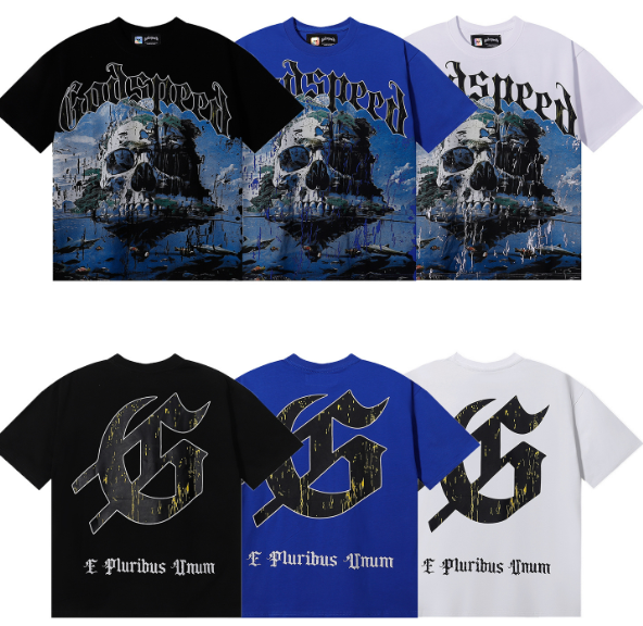 Camiseta informal de manga corta Godspeed con estampado de calavera y paisaje, de algodón puro de doble hilo de alta calidad, para hombre y mujer. Colores: negro, blanco y azul arcoíris. Tallas: S, M, L, XL, XXL.