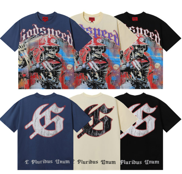 Camiseta informal de manga corta de algodón puro de doble hilo de alta calidad con estampado de jugador de béisbol de calavera Godspeed de estilo americano para hombres y mujeres